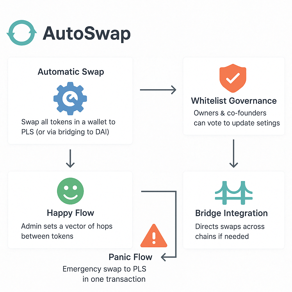 AutoSwap is een smartcontract dat automatisch je tokens kan omzetten naar PLS (de native token van PulseChain), zonder afhankelijkheid van externe bots, cronjobs of gebruikersinterface.
